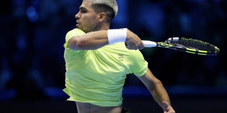 La fotografía de Carlos Alcaraz, sin camiseta, sentado y con la mirada baja, mostrando signos de agotamiento tras su victoria frente a Taylor Fritz en las ATP Finals de Turín, se ha difundido rápidamente. Esta imagen representa el cansancio, la tensión y el alivio que experimentó el murciano al conseguir su segundo triunfo en el torneo.
