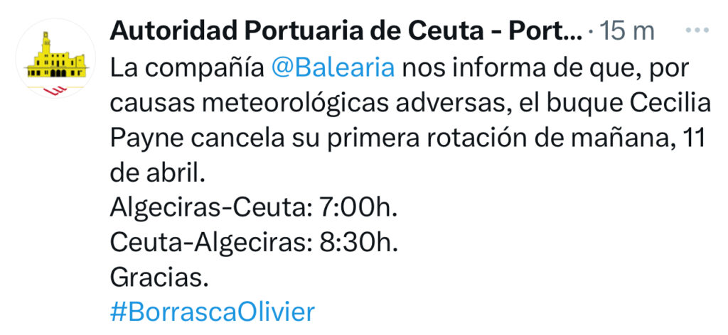 Ceuta, 10 de abril de 2025 – La compañía naviera Baleària ha informado a la Autoridad Portuaria de Ceuta de la cancelación de la primera rotación prevista para mañana, viernes 11 de abril, debido a las condiciones meteorológicas adversas provocadas por la borrasca Olivier.