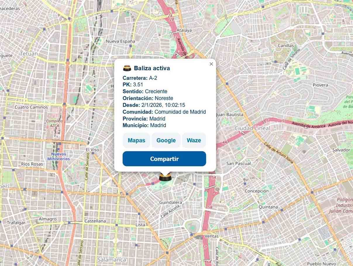 • Balizas apagadas: Señalan alertas recientes que ya han sido desactivadas, útiles para entender posibles retenciones o residuos en la carretera.