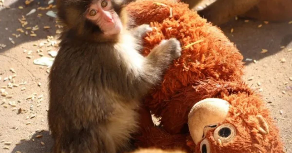 • Apoyo emocional: El macaco emplea este juguete como un recurso de protección. Come, duerme y juega junto a él, usando su abrazo cuando el ambiente social de la manada lo estresa.