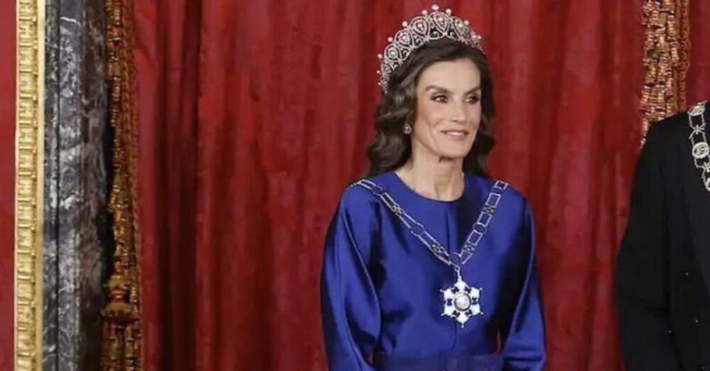 En el marco de la cena de gala celebrada en el Palacio Real para homenajear al sultán de Omán, Haitham Bin Tarik, la reina Letizia lució la emblemática tiara rusa, una de las joyas más relevantes de la Casa Real española, combinada con un vestido azul cobalto de The 2nd Skin.