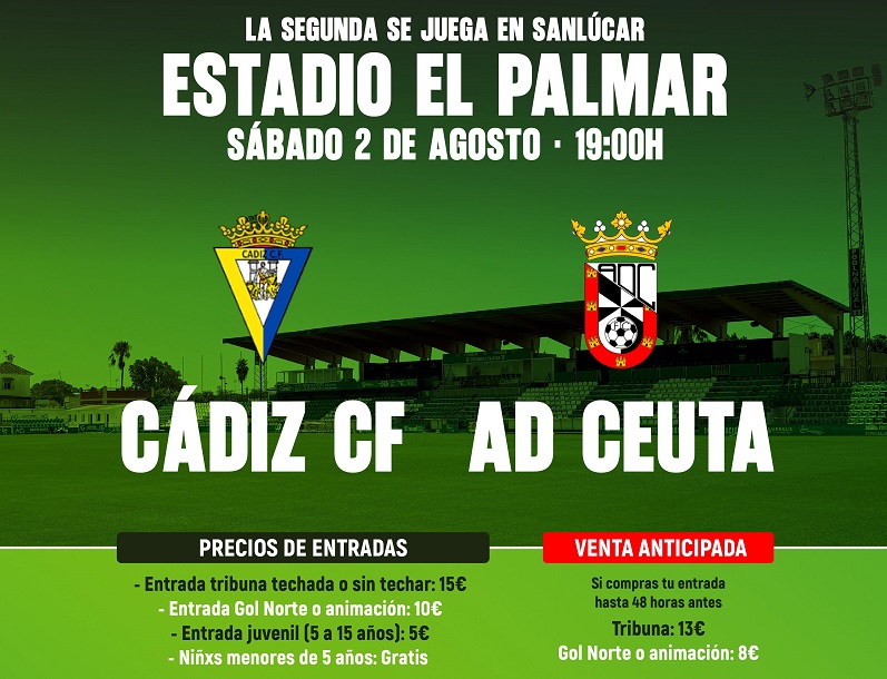 La AD Ceuta ha comunicado tarifas especiales dirigidas a grupos y familias con motivo del partido amistoso que disputará ante el Cádiz CF el próximo viernes 2 de agosto a las 19:00 horas en el estadio ‘El Palmar’ de Sanlúcar de Barrameda. Este encuentro servirá como preparación de pretemporada para ambos conjuntos, que compiten en Segunda División.